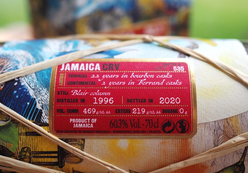 Après le Danemark nous traversons la frontière sud pour nous rendre en Allemagne et passer à une nouvelle bouteille. Nous changeons d’année puisque nous sommes face à un Long Pond daté de 1996 (tiens tiens, comme la série n°3) et frappé du mark CRV qui corresponds à une fourchette de 0 à 60 g/hlpa, soit le mark le plus faible de la distillerie. Après 22 longues années de vieillissement jamaïcain en ex-fût de Bourbon et 2 ans supplémentaires en Charente, nous voici face à un rhum contenant 219 g/hlpa d’esters pour 469 g/hlpa de congénères. Celui-ci a été embouteillé à 60,3% et à 535 exemplaires. Comme pour le danois, ce CRV est sorti à 250€.