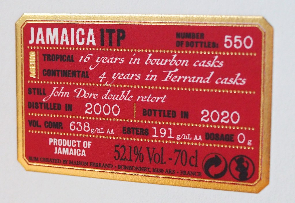 Première étape de ce road trip à travers l’Europe: le Danemark. Nos amis du nord ont donc sélectionné un fût de chez Long Pond, distillé en l’an 2000 et arborant fièrement le mark ITP (correspondant à un taux d’ester de 60 à 120 g/hlpa), déjà présent dans la série n°3. Je vous l’avais expliqué à l’époque, le mark est appliqué à la sortie d’alambic selon le taux d’esters mais ceux-ci évoluent tout au long du vieillissement. Dans le cas présent, le rhum présente un taux d’esters assez bas de 191g/hlpa (mais plus élevé que ce que son mark le laisse entendre), pour un taux de congénères de 638 g/hlpa. Le rhum a vieilli donc 20 ans répartis en 16 ans en Jamaïque en fût ex-Bourbon, suivis de 4 ans en Charente en fût Ferrand (donc ex-Cognac. Il a été mis en bouteille au titre de 52,1% à 550 exemplaires. Bien entendu, comme toute la série, le dosage (comprendre l’ajout de sucre) est à 0 g/l. Le prix de sortie, hors frais de rapatriement, était de 250€ à peu près… une somme donc!
