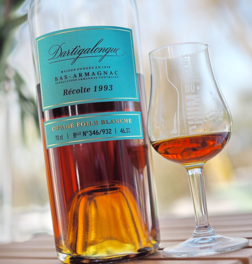 Je ne vous refais donc pas tout le contexte et nous plongeons directement sur la bouteille qui nous occupe aujourd’hui. Celle-ci vient de la maison Dartigalongue qui est une figure ancestrale de la région et élève des Armagnacs de différents producteurs depuis 1838 tout de même. Et parmi ces bouteilles plus ou moins connues des amateurs il y en a une qui a fait le « buzz » dans le petit monde des spiritueux il y a quelques mois. Mais pourquoi ça me direz-vous? Et bien tout simplement parce que malgré son âge somme-toute classique dans l’Armagnac (27 ans de fût), il s’agit là d’un 100% Folle Blanche. Et la Folle Blanche, nous en avions déjà parlé lors du voyage dans la gamme l’Encantada, c’est la « star » locale. À tort ou à raison, certains (dont moi 😉 ) l’adorent de par ce que ce cépage peut apporter à l’eau-de-vie qui en découle. Les vieux Armagnacs mono-cépage n’étant pas légion, voici le pourquoi du comment du buzz. Dans ce cas-ci nous sommes donc comme je l’ai dit sur un Armagnac de 27 ans, millésimé de 1993, et embouteillé à 46,3%. Il est vendu chez Dartigalongue au prix de 145€. Plongeons-nous donc dans la note de dégustation de cette jolie bouteille 🙂