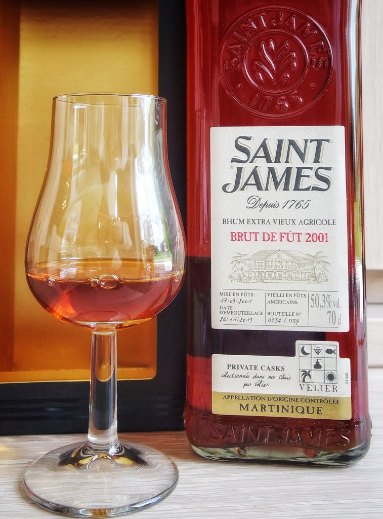 La seconde cuvée est passée plus discrètement dans la sphère du rhum: un millésime 2001, de 18 ans, titrant à 50,3% et sélectionné par Velier. Sur celle-ci le packaging reprend les codes standard de Saint James, à savoir la même bouteille traditionnelle carrée mais dans un simple étui carton noir/doré (comme pour la cuvée du millésime 2008 sélectionnée pour les 70ans de Velier). Cette sélection arbore une mention « Private Casks » qui sous-entend qu’elle est un assemblage de 4 fûts. Il y a eu 1157 bouteilles produites (exclusivement pour l’Italie) avec un prix de sortie d’environ 150€ également. Maintenant, place à la dégustation.
