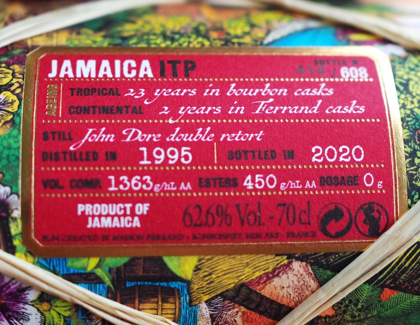 Le rhum a été distillé en 2003 donc et vieilli 16 ans sur place avant de passer 1 an en Charente. L’étiquette nous informe d’un dosage à 0 g/l à nouveau et arbore le mark « MMW », synonyme d’un titre en esters entre 200 et 300 g/hlpa lors de la distillation.