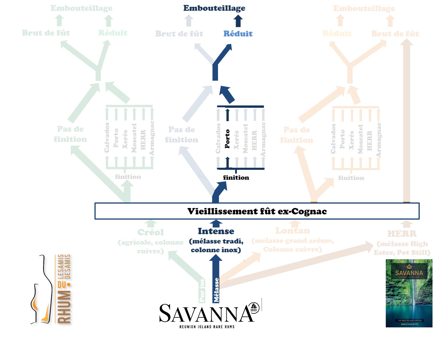 Je vous l’ai dit, Savanna a opéré une refonte complète de sa gamme standard. Exit le 3ans et le 7 ans, nouvelle identité visuelle pour le 5 ans et surtout ajout d’une nouvelle référence baptisée, en toute modestie, « Le Must ». D’un point de vue esthétique on remarquera le nouveau logo (oui le précédent n’était pas très vieux, je sais) mais surtout la présence d’une (jolie) boîte avec une belle photo, les références standard précédentes étant présentés (au mieux) en canister monochrome. Concentrons-nous maintenant sur l’étiquette, ou plutôt les informations qu’elle contient. La première mention est « Rhum traditionnel très vieux de la Réunion ». Pour rappel, le terme « traditionnel » n’a rien à voir avec la matière première mais à voir avec le taux de non-alcools (ou congénères) qui doit être supérieur à 225 g/hlap. Le « très vieux » se complète avec la description en contre-étiquette pour nous indiquer un contenu de minimum 6 ans et jusque 9 ans. Vient ensuite l’indication « vieilli en fût de chêne français » qui indique un vieillissement en fût classique (ex-Cognac donc) chez Savanna. Pour le reste on sait qu’il s’agit d’un assemblage de rhums de mélasses distillées en colonne, en l’occurrence du rhum industriel classique et du rhum Grand Arôme, qu’il est produit en quantité limitée (sous-entendu, par batch/série, nous sommes ici sur le premier batch) et qu’il est commercialisé aux alentours de 65€ en métropole.