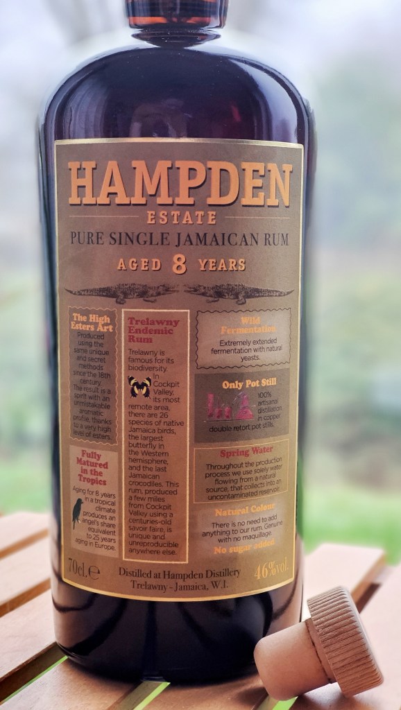 Première étape, commençons par la référence la plus accessible et la réelle entrée de gamme chez Hampden Estate: cet assemblage de 8 ans, version réduite. Pas question ici de marks, de millésime ni d’autres détails, nous savons seulement qu’il s’agit d’un assemblage de rhums de 8 ans, passés sur place bien entendu, réduits à 46%. Cette bouteille a été mise sur le marché (avec sa grande sœur « high proof ») pour lancer la gamme officielle de la distillerie, qui jusque là n’embouteillait que très peu de rhum elle-même. Inutile de dire qu’à une soixantaine d’euros, cette bouteille est un must have pour tout débutant dans le rhum, histoire d’ouvrir son horizon avec un rhum facilement trouvable et pourtant très typé.