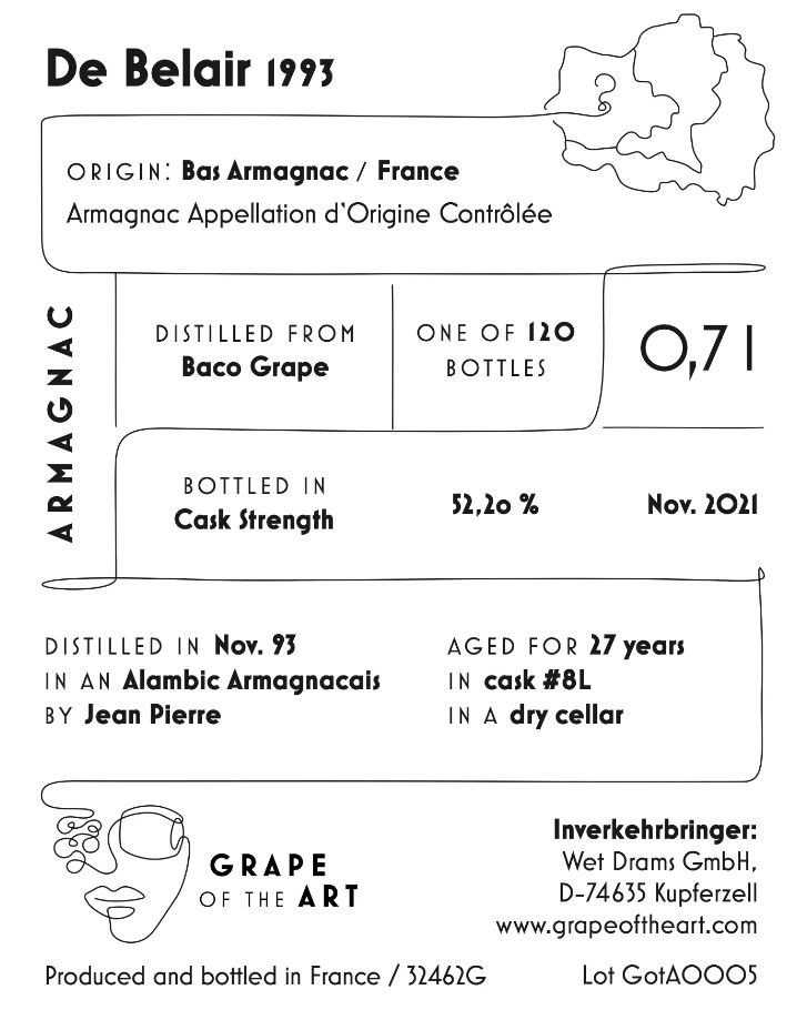 Retour dans le Bas-Armagnac pour cette nouvelle collaboration entre Grape of the Art et L’Encantada. Direction donc le domaine de Belair pour un Armagnac 100% Baco, distillé en 1993 et embouteillé 27 ans plus tard à seulement 120 exemplaires, titrant à 52,2%. Comme pour le précédent, inutile de chercher à en acquérir une malheureusement, même si le prix était un peu plus élevé puisqu’elle est sortie à 160€.