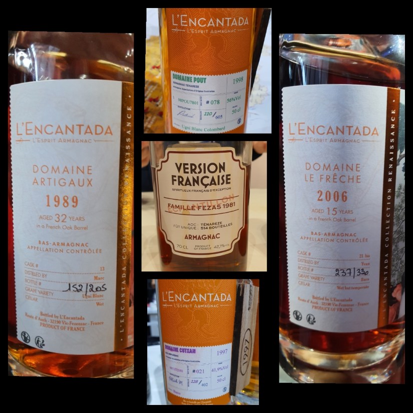 Maintenant que le dossier « rhum » est traité on peut aller saluer les amis et passer à l’Armagnac 🙂 Premier arrêt donc les amis de L’Encantada. Bon soyons franc, on a surtout discuté en dégustant l’une ou l’autre référence, ce qui fait que niveau notes c’est très pauvre de mon côté… À noter principalement chez eux la nouvelle « Collection Renaissance« , qui débute avec trois sélections embouteillées non pas dans les bouteilles classiques de la marque mais dans une bouteille qui se veut plus esthétique et « collectionnable ». Au programme il y a un Le Frêche 2006 de 15 ans (330 bouteilles), un Cutxan 2006 également (donc 15 ans lui aussi, 240 cols) et enfin un Artigaux 1989 de 32 ans (205 bouteilles). Les bouteilles sont illustrées avec les œuvres d’une artiste (Mariyem Moutaouakkil) et sont en train d’être commercialisées à l’heure où je vous écrit. J’ai goûté les trois mais impossible de vous en dire plus, faute de notes (oups).