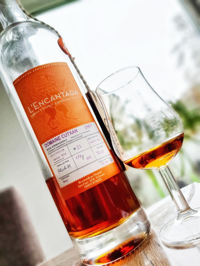 Plongeons-nous donc aujourd’hui dans ce Bas-Armagnac du domaine Cutxan, dont le vignoble est planté de Baco, ce cépage qui donne tant de caractère aux eaux-de-vie. Distillé en 1997, il a passé 24 ans en fût avant d’être embouteillé à un taux léger de 41,9%. Voyons voir ce qu’il a à nous raconter 😉